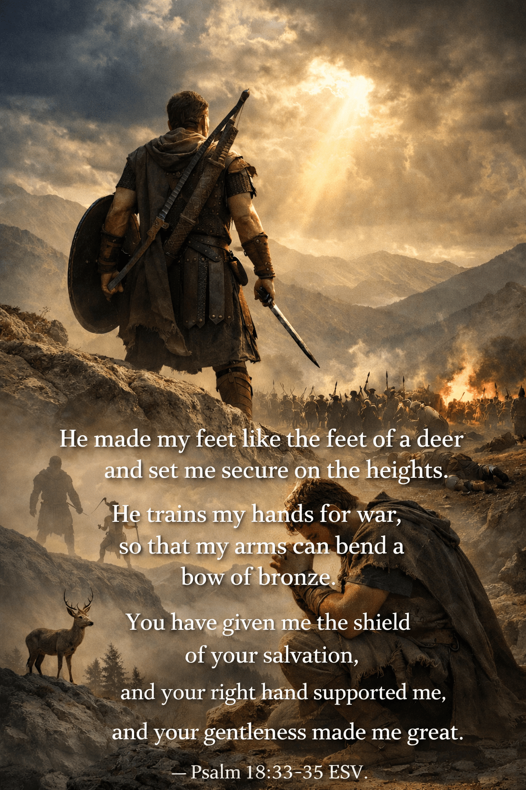 “For who is God, but the LORD And who is a rock, except our God?— The God who equipped me with strength And made my way blameless. He made my feet like the feet of a deer And set me secure on the heights. He trains my hands for war, So that my arms can bend a bow of bronze. You have given me the shield of your salvation, And your right hand supported me, And your gentleness made me great.” – Psalm 18:31–35 (ESV)