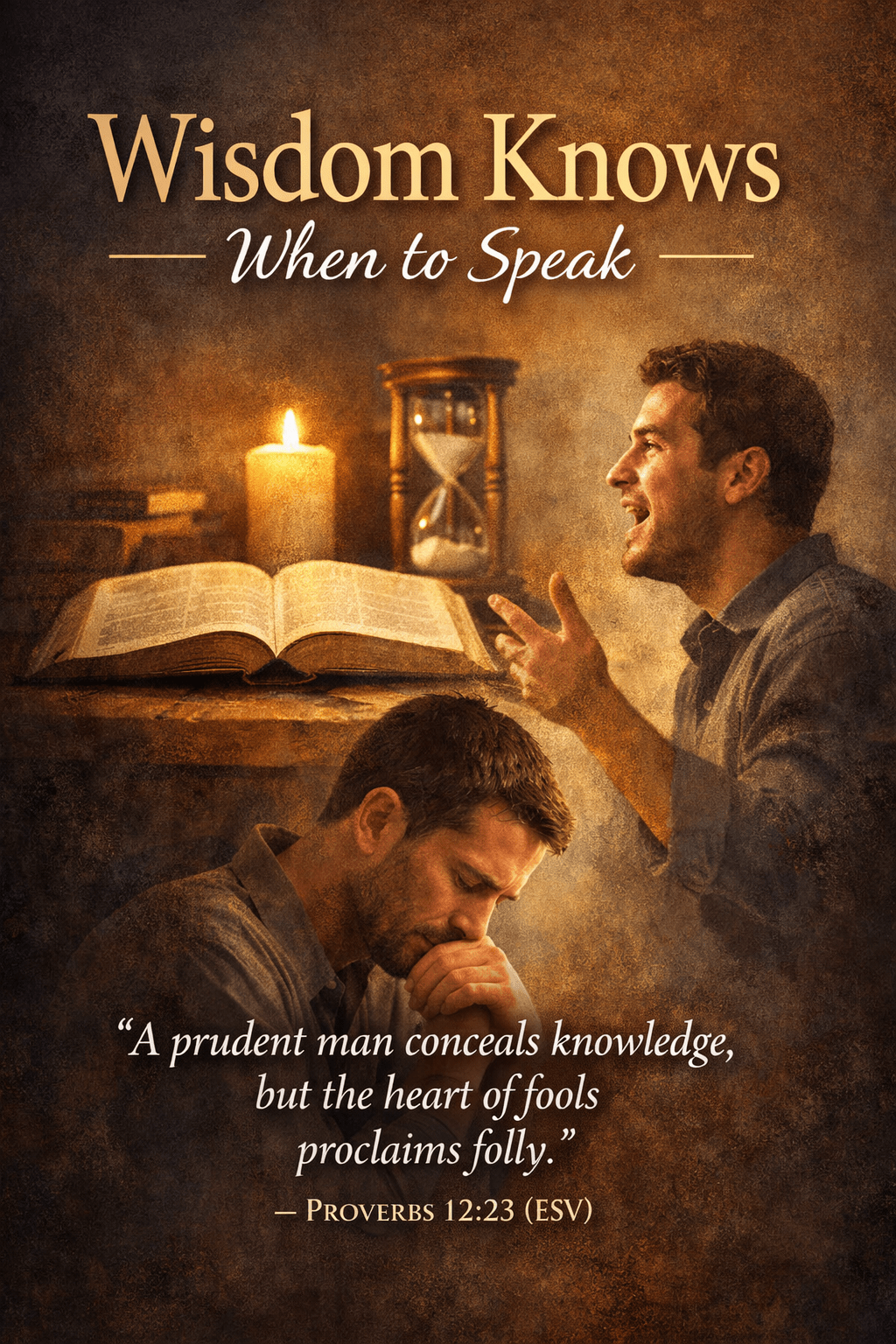 Proverbs 12:23 highlights a subtle but important mark of true wisdom: knowing not only what to say, but when to say it—and when to remain silent. Have you ever seen this proverb play out in real life? It usually goes like this: the quiet and calm man seems very wise. He’s known as a man of few words. Whereas, the loud fool will tell you everything he knows, usually in a matter of minutes and with nobody asking him. Solomon, here in Proverbs 12, gives an excellent explanation, in few words.