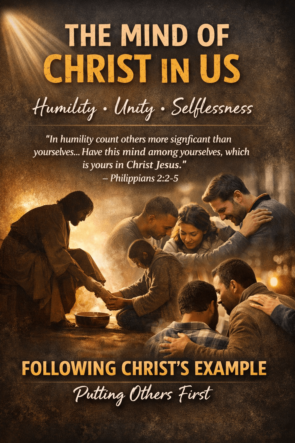 Closing Prayer Lord, thank You for the example of Christ, who humbled Himself and served others even though He is Lord of all. Forgive me for the ways I cling to pride, selfish ambition, and my own interests. Teach me to think like Christ—to value others, to seek unity, and to serve with humility. By Your Spirit, shape my heart to reflect Jesus more and more. Help our church to be united, not by our own efforts, but by the transforming power of Your Spirit. Amen.