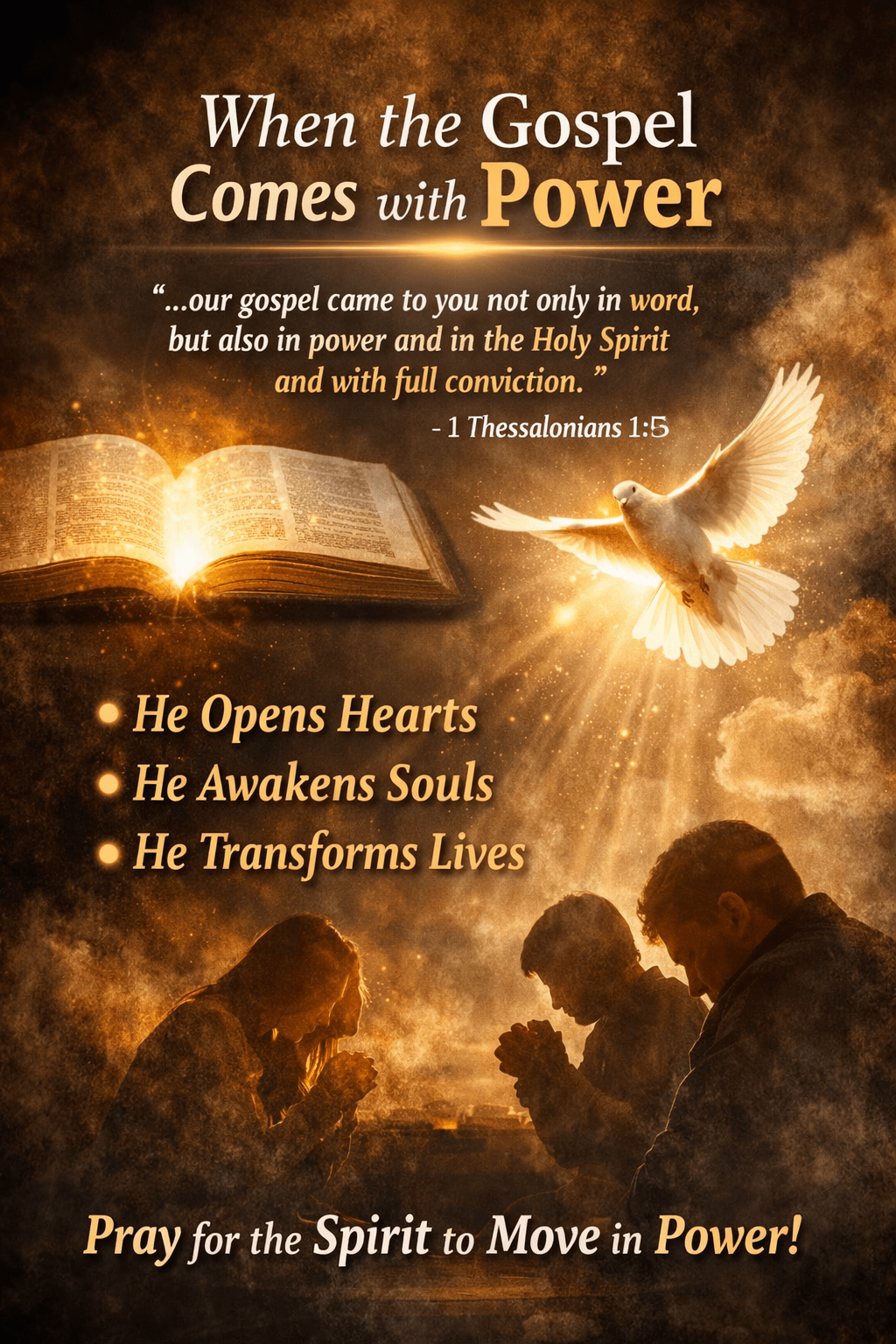 Heavenly Father, thank You that the gospel is not just words, but power through Your Spirit. Forgive me for the times I have relied on my own understanding or ability instead of depending on You. Teach me to trust in the work of the Holy Spirit—to pray more, to depend more, and to believe more. Open the hearts of those I love who do not yet know You. Give them eyes to see, ears to hear, and hearts that are alive to the truth of the gospel. And as I share Your Word, let it be with Your power, Your Spirit, and full conviction. In Jesus’ name, Amen.