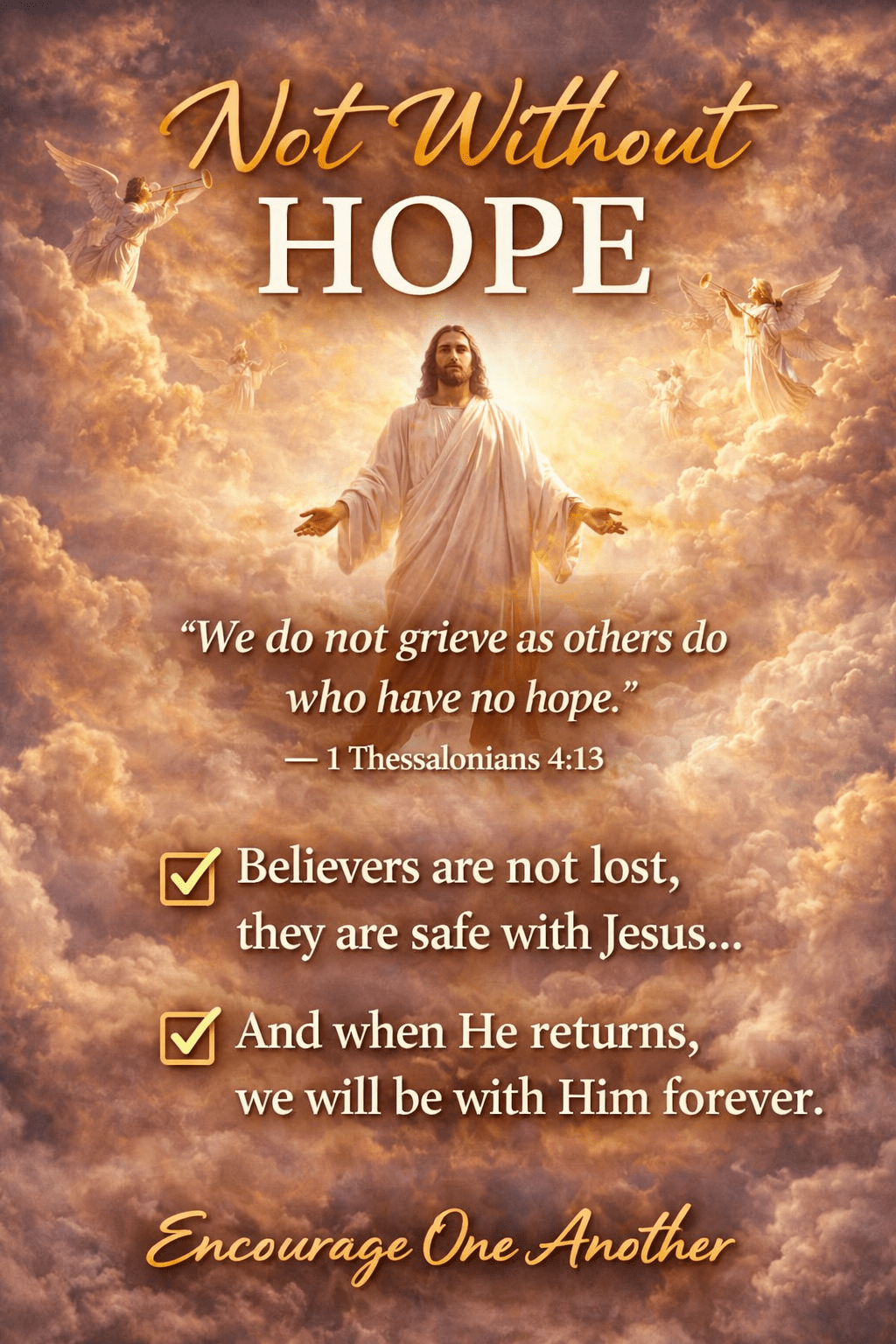 Heavenly Father, thank You for the hope we have in Jesus Christ. Thank You that death is not the end, and that those who belong to You are safe in Your presence. Help me to grieve with hope, to trust in Your promises, and to encourage others with the truth of Your Word. Fix my eyes on the day when I will be with You forever. In Jesus’ name, Amen.